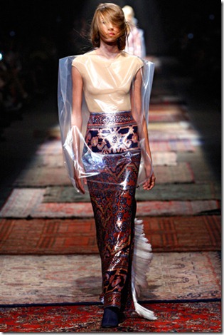 As usual, loving the sheerness mixing with the tough leather look, very standard Margiela. Loving the last 3 looks here, you can’t go wrong with plastic for me. The carpet printed skirt is so lush, that’s definitely my favourite look from the show.